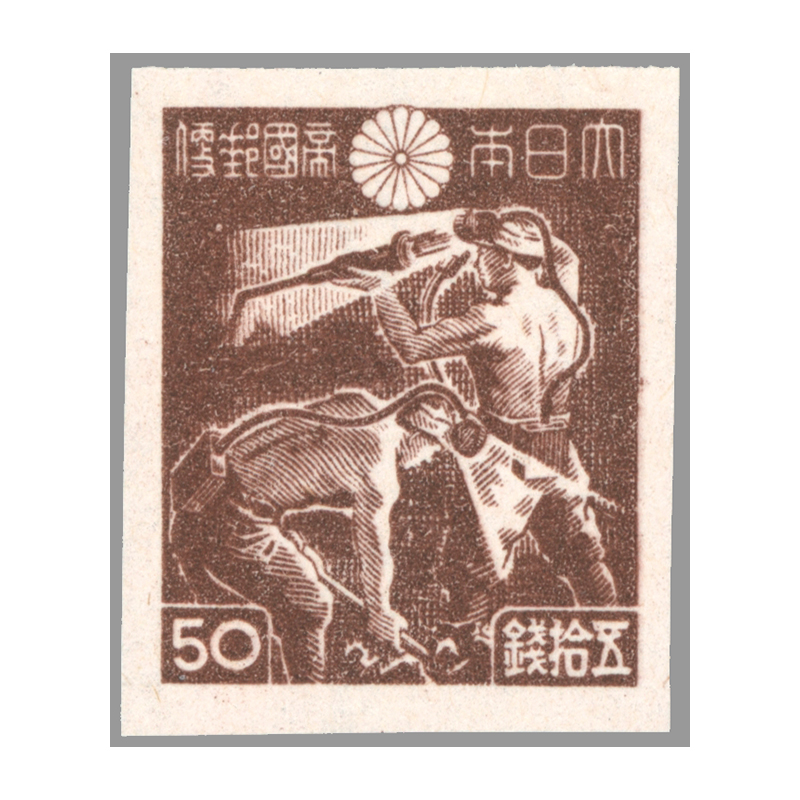 第3次昭和切手は、戦局の悪化とともに物資困窮の最悪の状況下で、簡素な平版印刷で製造された。目打と糊がない3銭から10円までの10種を指す。用紙は白紙・灰白紙(灰色がかった白紙)・粗紙(異物の混入が多い茶色がかった紙)の3種類があり、雲型の「昭和すかし」が入っている。