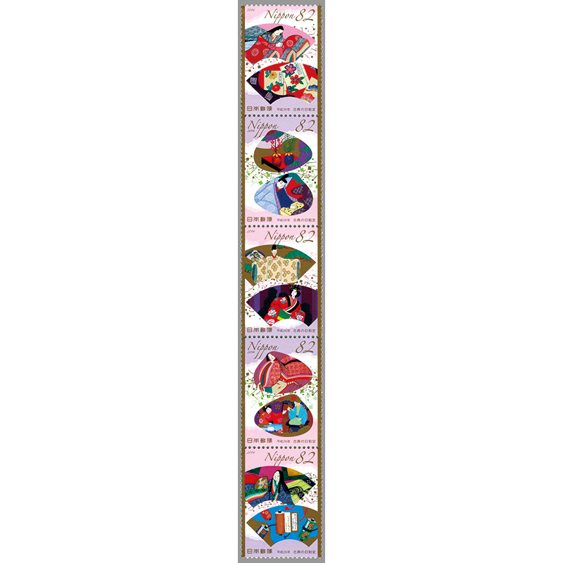切手シート全体を料紙(染料や顔料で色付けしたり、金・銀の箔で装飾した紙)に見立て、さらに各切手の画面を扇型及び貝覆いを想起させる蛤形にすることにより、古典のイメージを表現。