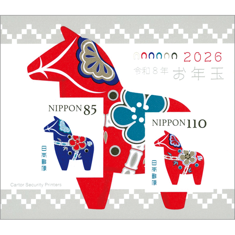 洋風感のある馬型の置物を和風にアレンジし、馬具には松竹梅の文様をあしらい、おめでたいデザイン。2026年用年賀はがき(インクジェット写真用)の料額印面デザインと連動している。