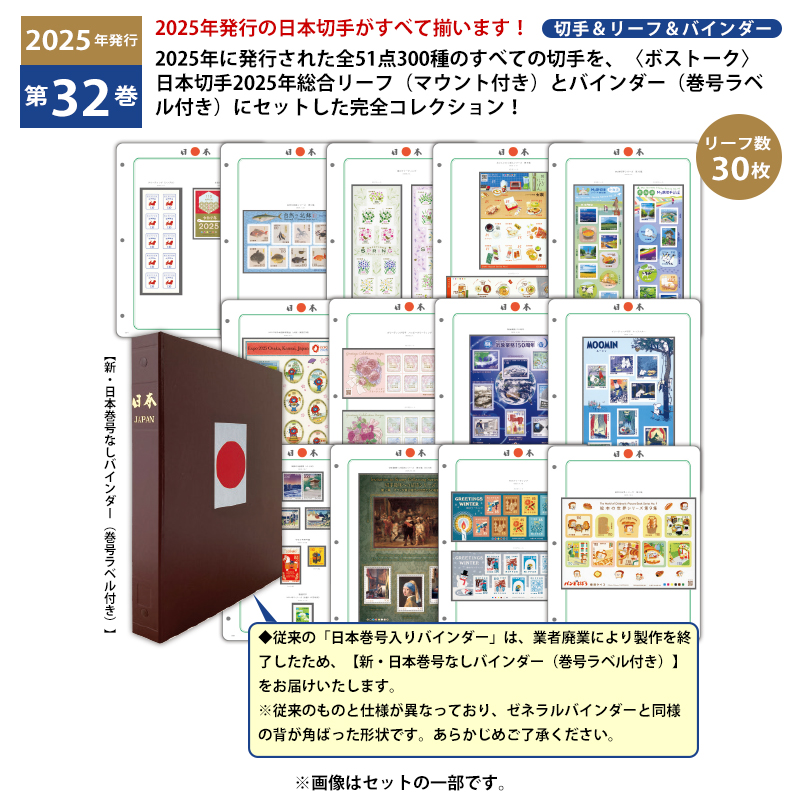 2025年に発行された全51点300種すべての切手を、<ボストーク>日本切手2025年総合リーフ(マウント付き)に収め、バインダーにセットした完全コレクション!