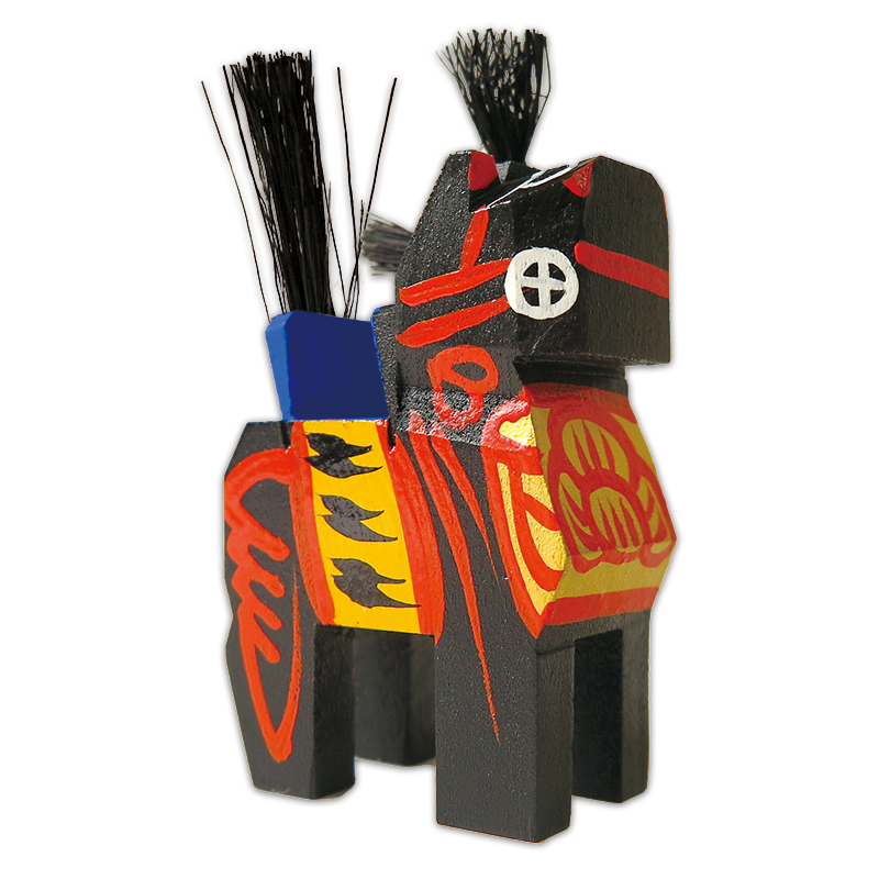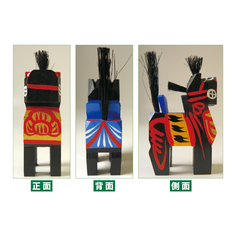 直線でつくられた造形と色鮮やかな紋様が特徴。黒駒は子宝・安産・子育てのお守りとして親しまれている。