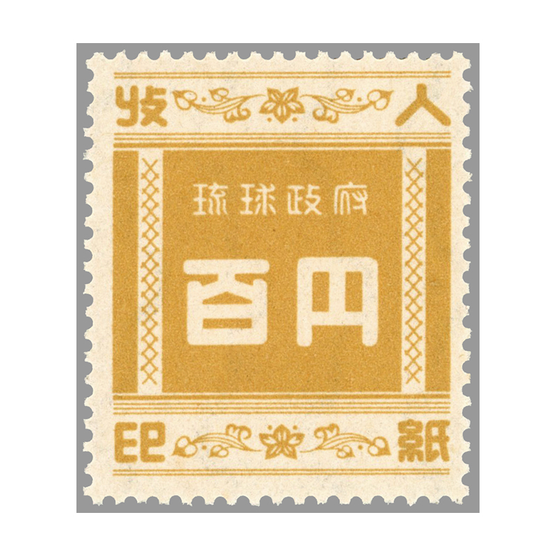 全琉球統一以後、正刷収入印紙が数回にわたり発行された。ご案内品は、正刷として沖縄で最初に発行された額面のうちの100円。