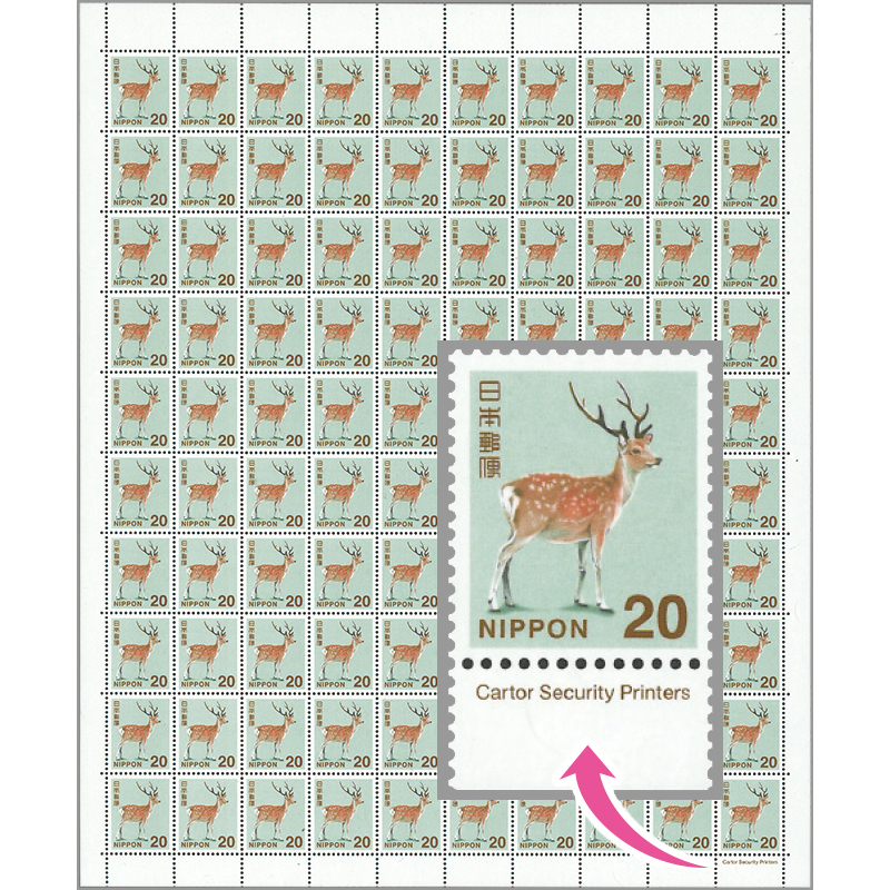 ニホンジカ20円【(新カルトール社製)Pos.100銘版+カラーマーク・計数番号なし】シート