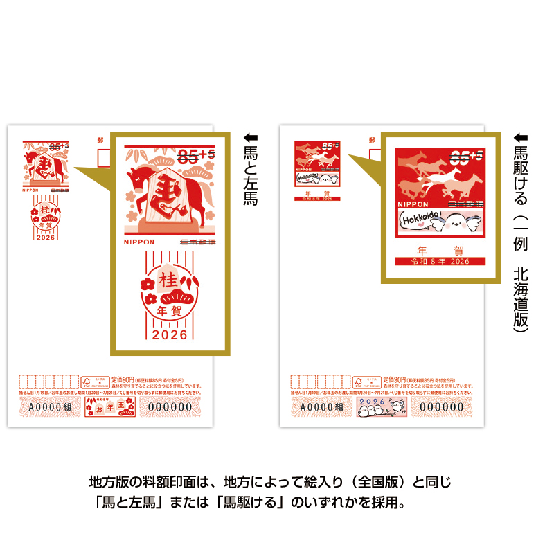 地方版の料額印面は、地方によって絵入り(全国版)と同じ「馬と左馬」または「馬駆ける」のいずれかを採用。