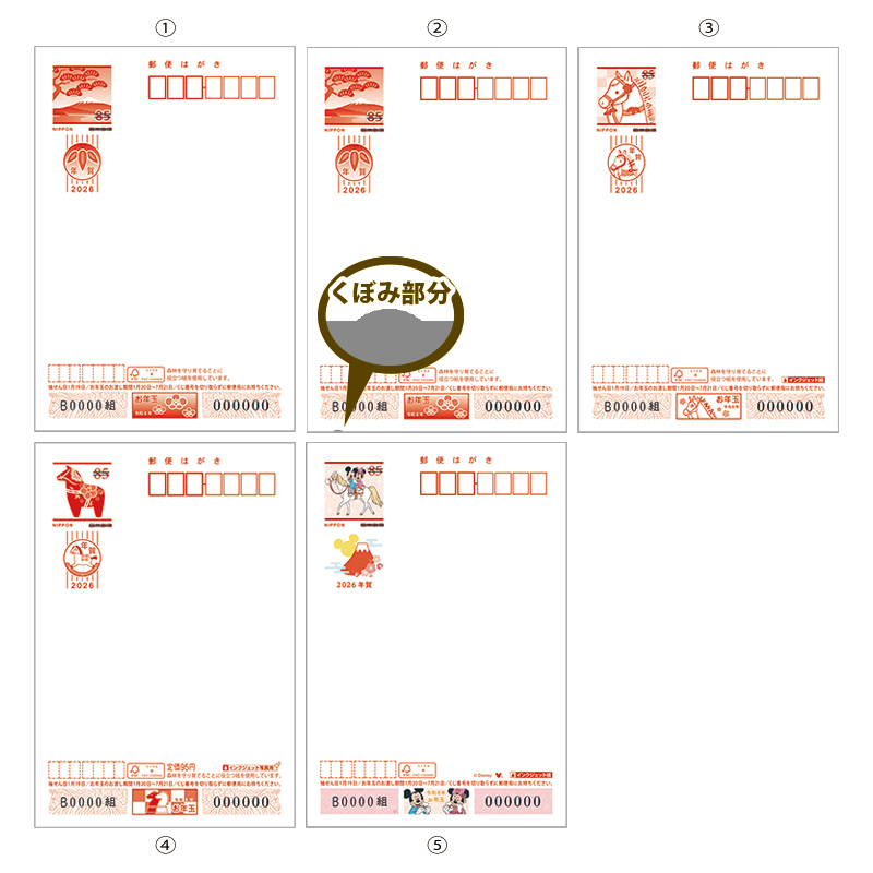 ①単面無地(富士山と松) ②単面無地くぼみ入り(富士山と松) ③インクジェット無地(白馬と松竹梅) ④インクジェット写真用(馬の置物) ⑤ディズニーキャラクターインクジェット紙(ディズニー)。ミッキーマウスとミニーマウスが白馬に乗っているデザイン。隠れミッキー(15個)を織り交ぜ、楽しんでいただけるデザインとなっている。