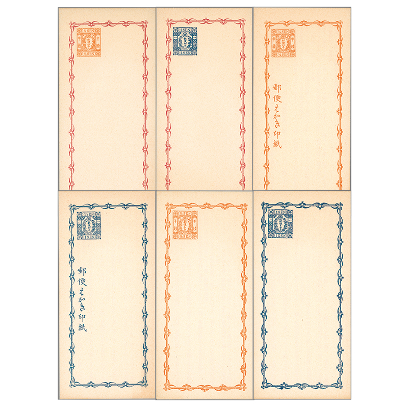 ●紅枠二つ折りはがき半銭(だいだい黄)「ニ」/1銭(青)「イ」/脇付き二つ折りはがき半銭(だいだい黄)「ニ」/1銭(青)「イ」の4種は、官製模造のリプリント。脇なし二つ折りはがき半銭(だいだい黄)「ト」/1銭(青)「ヌ」の2種は、通常はがきのリプリント。以上計6種のセット。