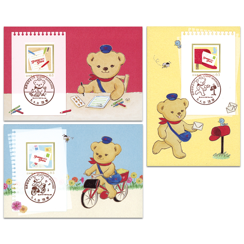 <63円1種貼り3枚セット>記念「ぽすくま」ポストカード3種(お手紙書くね、配達中、ゆうびんで〜す)に、フレーム切手63円3種(レトル、ポーター、リヴレ)をそれぞれ貼付し、会期中の日替小型印を押印(いずれも浅草局)。