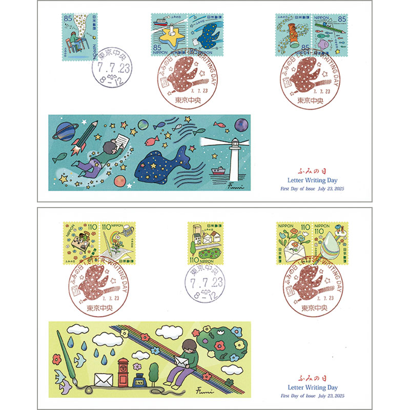 110円は、花の思い出、便箋に咲く花、しずくと花と郵便ポストほかを描く。