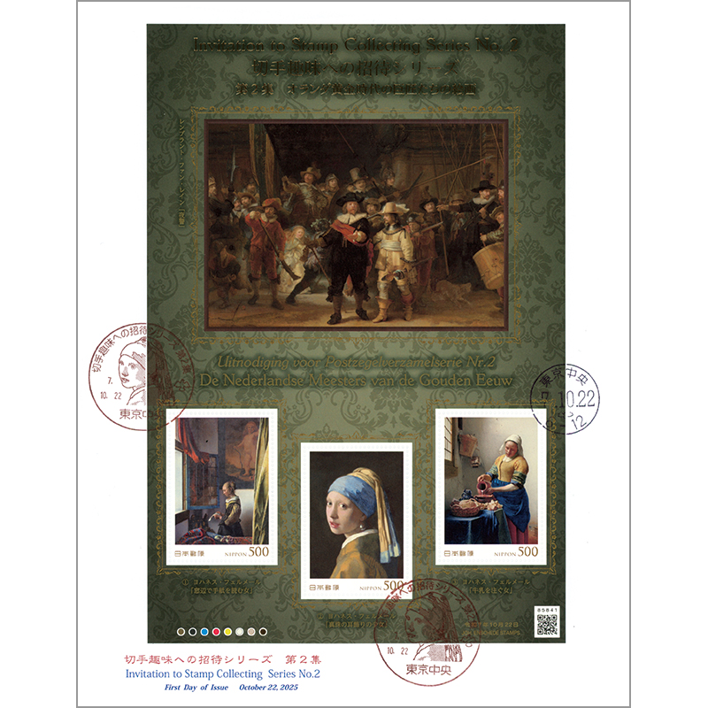 500円3種には、ヨハネス・フェルメール作「窓辺で手紙を読む女」アルテ・マイスター絵画館(ドイツ)所蔵、「真珠の耳飾りの少女」マウリッツハイス美術館(オランダ)所蔵、「牛乳を注ぐ女」アムステルダム国立美術館(オランダ)所蔵の作品が、シート地にはレンブラント・ファン・レイン作「夜警」アムステルダム国立美術館所蔵をレイアウトしています。