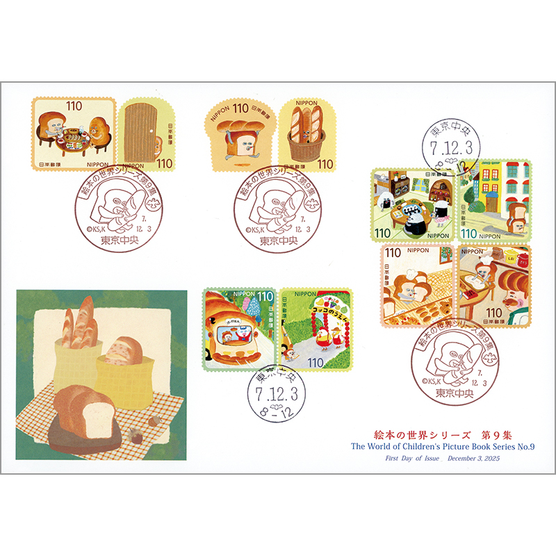 切手題材は、にせパンどろぼう、なぞのフランスパン、おにぎりいっかの しょくたく、パンやのおじさん、パンをおとどけにほか。