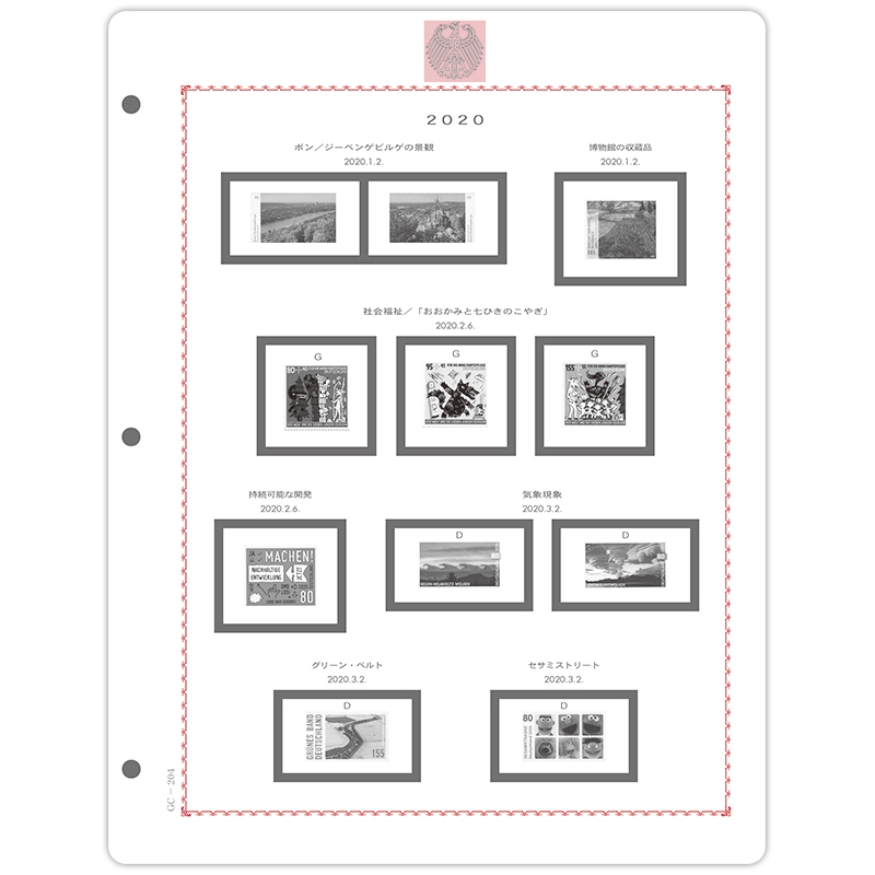 ヨコ216×タテ279ミリ。ドイツ切手2020-2021年発行分収納用、14枚。切手を挟む透明フィルム(マウント)の付いていないリーフ。切手の収納にはヒンジ、またはマウントをご利用ください。