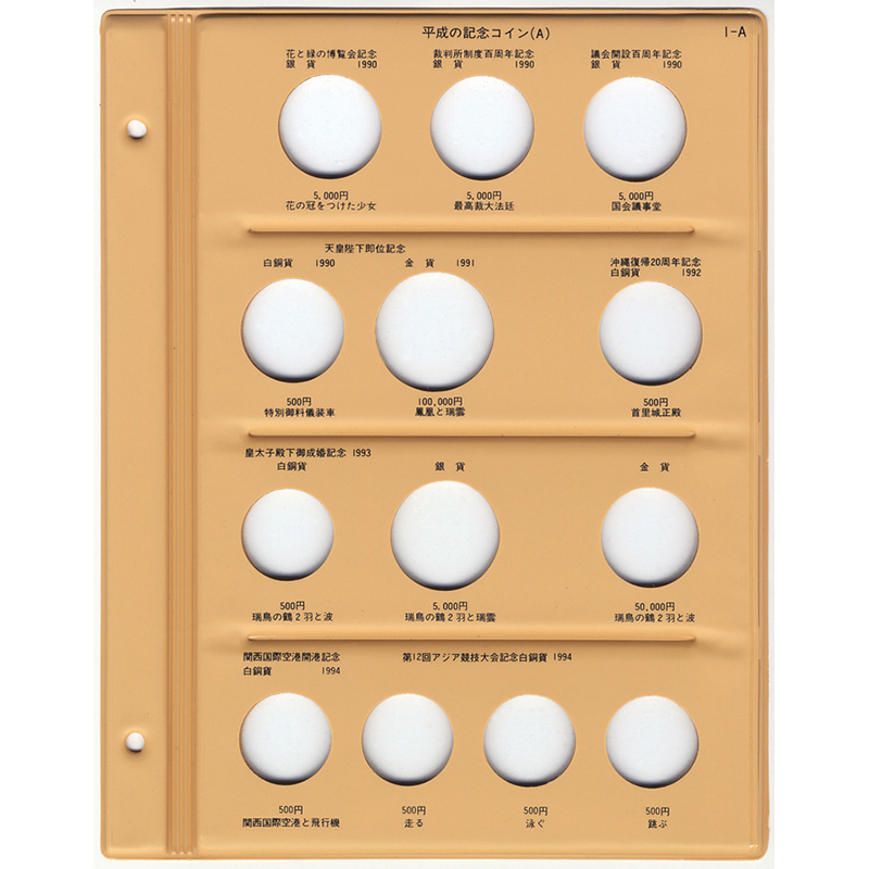 平成発行の記念コイン、国際花と緑の博覧会記念銀貨(平成2年/1990年)〜第12回アジア競技大会記念白銅貨(平成6年/1994年)の収納用台紙。テージー製。