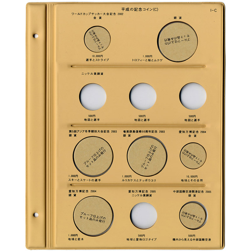 平成発行の記念コイン、ワールドカップサッカー大会記念 金・銀・ニッケル黄銅貨(平成14年/2002年)〜中部国際空港開港記念銀貨(平成17年/2005年)の収納用台紙。テージー製。
