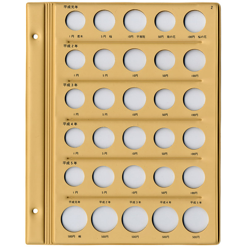 平成元年〜5年(1989年〜93年)発行の普通コイン(1・5・10・50・100・500円)の収納用台紙。テージー製。