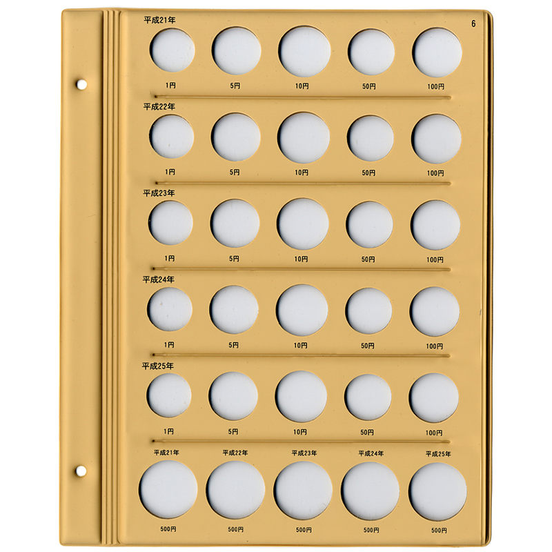 平成21年〜25年(2009年〜13年)発行の普通コイン(1・5・10・50・100・500円)の収納用台紙。テージー製。
