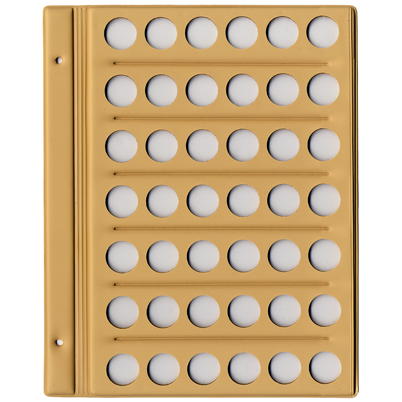 お手元のコインを手軽に整理できる無地の台紙です。直径20ミリの大きさの穴がヨコ6列タテ7段で42個並んでいます。テージー製。