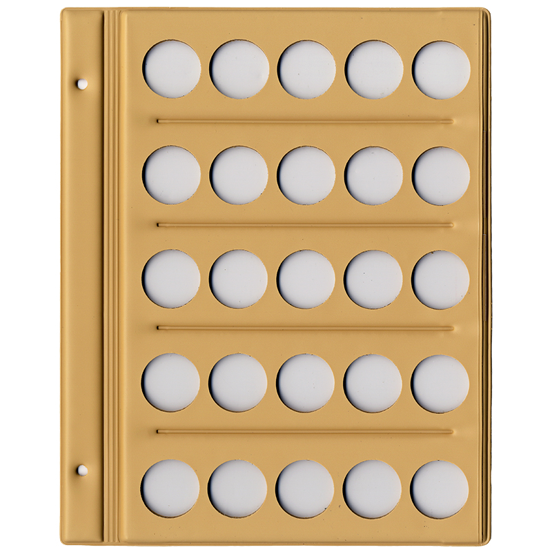 お手元のコインを手軽に整理できる無地の台紙です。直径27ミリの大きさの穴がヨコ5列タテ5段で25個並んでいます。テージー製。