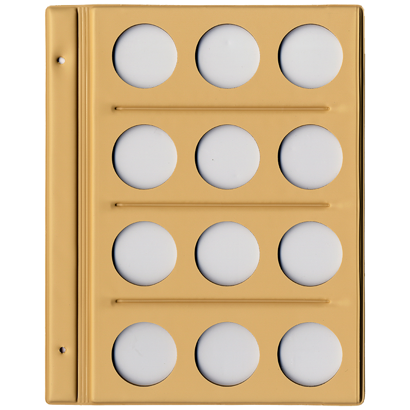 お手元のコインを手軽に整理できる無地の台紙です。直径40ミリの大きさの穴がヨコ3列タテ4段で12個並んでいます。テージー製。