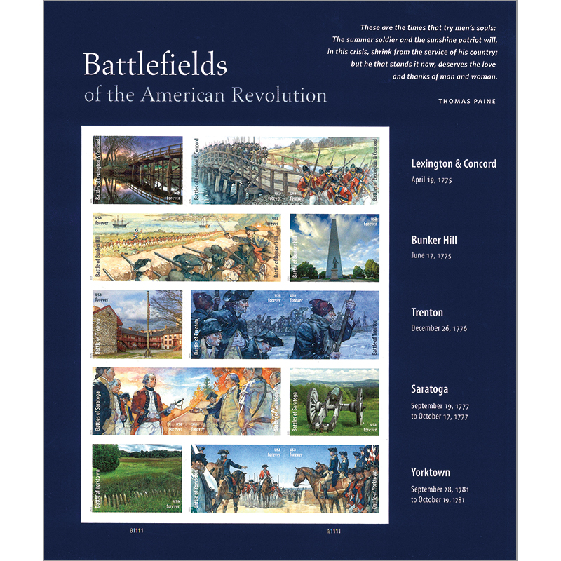 北米東部沿岸の13のイギリス植民地とイギリス本国との戦争で行われた5つの戦闘を描くイラスト(2種連刷)と史跡。