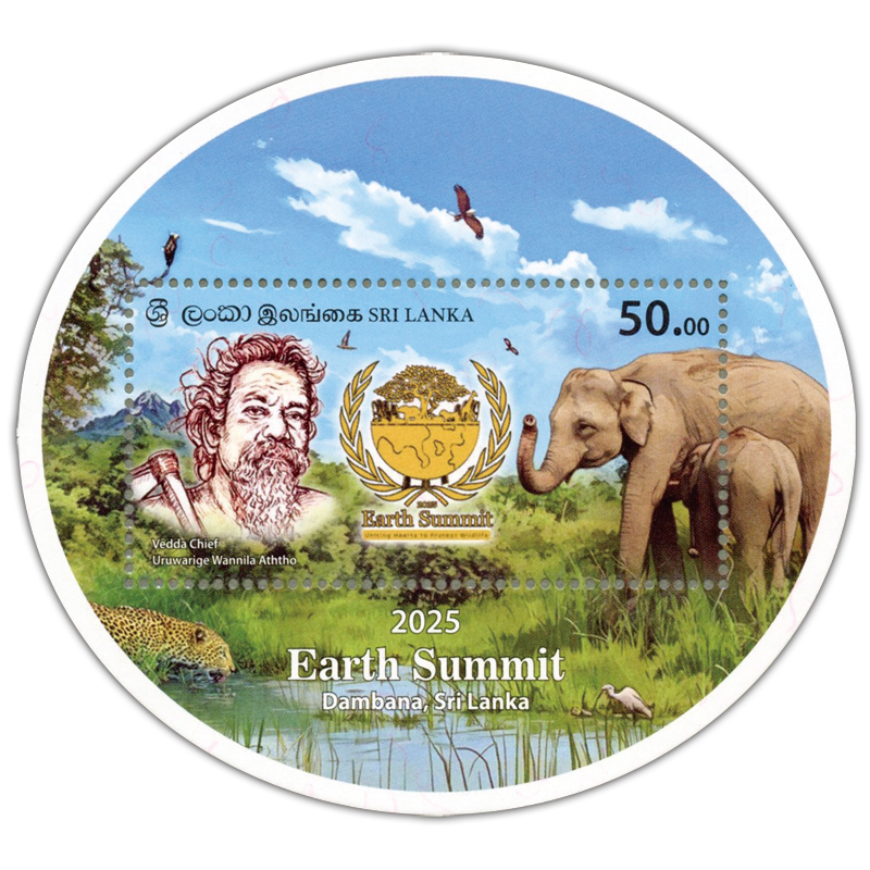 円形シート。「環境と開発に関する国際連合会議」。ウバ州ダンバナ村で「心を一つにして野生生物を守る」というテーマで開催。ダンバナ村の狩猟採集民ヴェッダ族の首長ウルワリゲとスリランカ象。中央にロゴ。