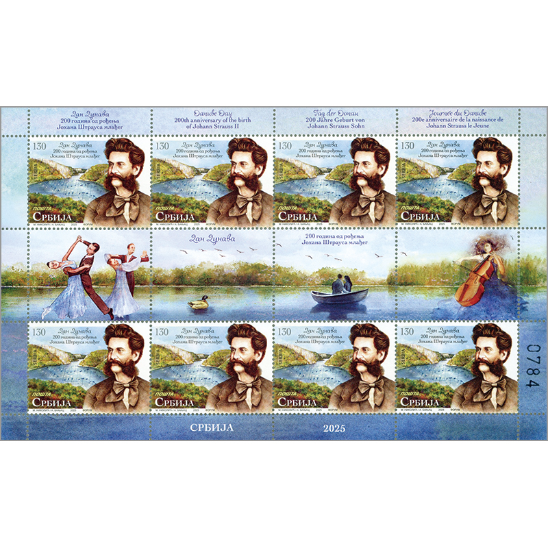 首都ベオグラードを流れるドナウ川を背景に、今年誕生200年を迎えた「ワルツ王」ヨハン・シュトラウス2世の肖像と“ドナウ川の国歌”ともうたわれるシュトラウス2世の代名詞的ウィンナワルツ「美しく青きドナウ」の楽譜。
