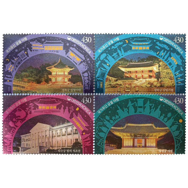 国家遺産庁宮陵遺跡本部が主催する首都ソウルの王宮夜間観覧ツアー。メタリックな箔押し印刷で星月の明かりに浮かぶ夜の宮殿を描く。