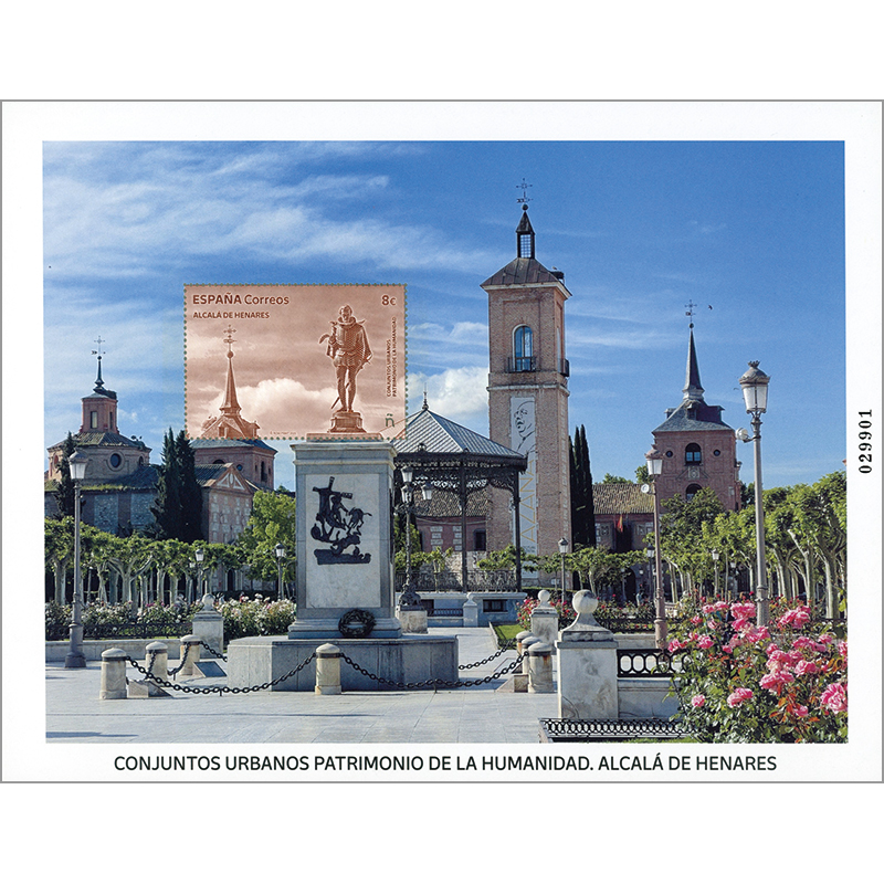 「アルカラ・デ・エナレスの大学と歴史地区」。15世紀末、世界で最初に“計画的に建設された大学都市”として建設され発展した首都マドリード近郊の都市。この地で誕生した『ドン・キホーテ』の作者・文豪ミゲル・デ・セルバンテス(1547〜1616)を記念するセルバンテス広場、切手部分(凹版)にセルバンテスの像を描く。