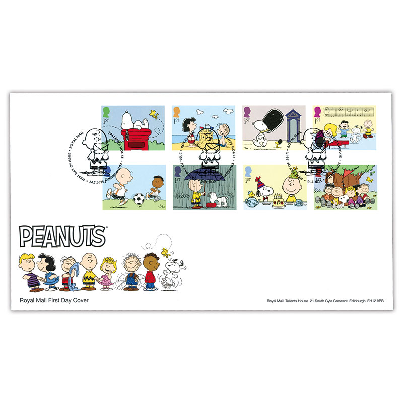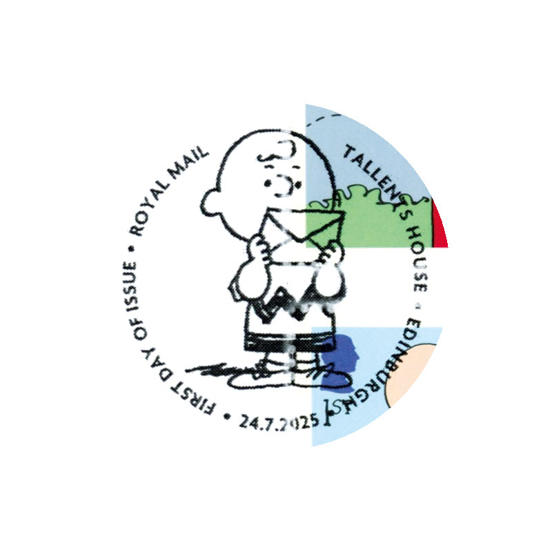 消印はエジンバラ局(タレントハウス)。手紙を手にするチャーリー・ブラウン。