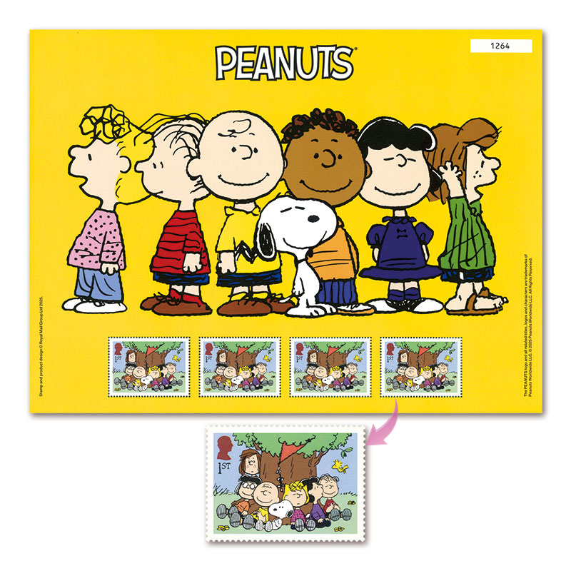 切手は、60年代からたびたび登場する「凧食いの木」。シート地は、「ピーナッツ」の仲間たち(サリー、ライナス、チャーリー・ブラウン、スヌーピー、フランクリン、ルーシー、ペパーミントパティ)。