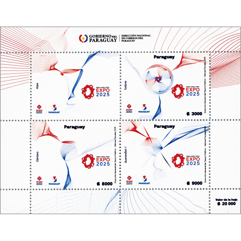パラグアイ国旗の色、赤白青を使って描かれたタービン、水瓶、キューブ型小型衛星「ガラニサット・ワン」。