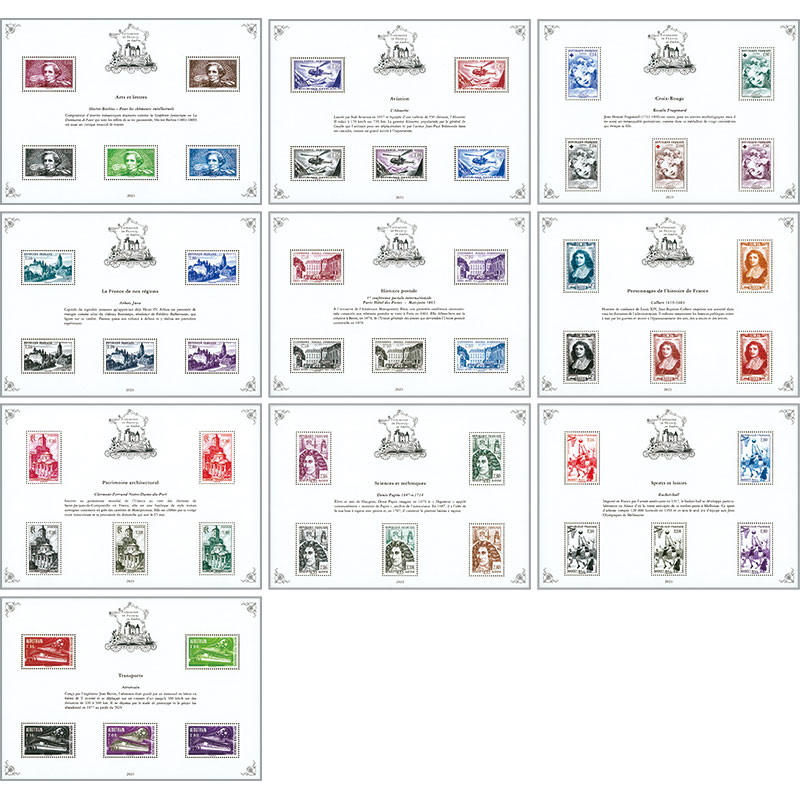 フランス郵政がプロデュースする、「10のテーマ」から選出した珠玉の凹版切手50種を復刻するコレクションシリーズ。各テーマごとに名品切手を選出して復刻した切手シート10種と特別シート1種をセットにしたスペシャルパックを2019年から5年間にわたって発行。各シートは、オリジナルの切手と同図案で額面が異なる切手を、下中央にオリジナルの刷色で1種、左右に異なる刷色で2種ずつ、計5種を収める。