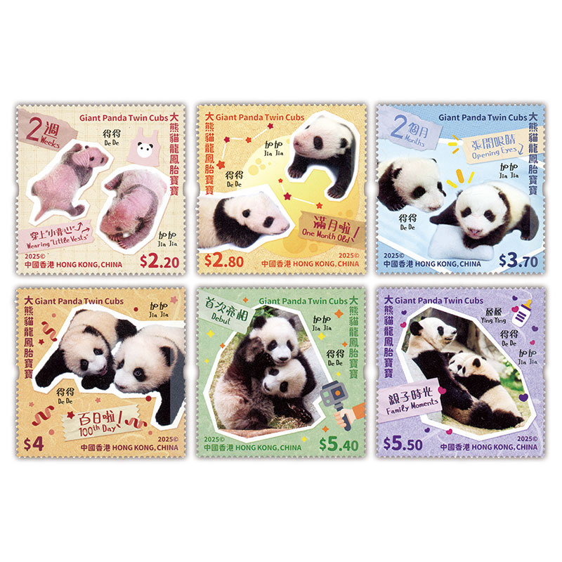 切手は、生後2週間目、1カ月、2カ月、100日目、一般公開(2025年2月16日から)、母親の「盈盈(インイン)」と双子。
