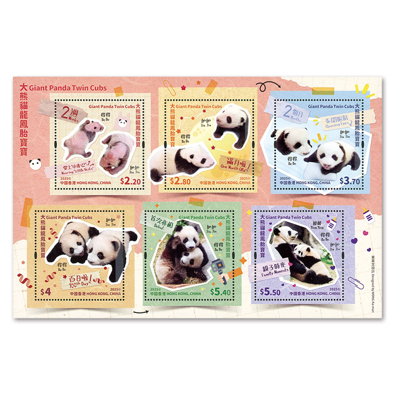 切手は、生後2週間目、1カ月、2カ月、100日目、一般公開(2025年2月16日から)、母親の「盈盈(インイン)」と双子。