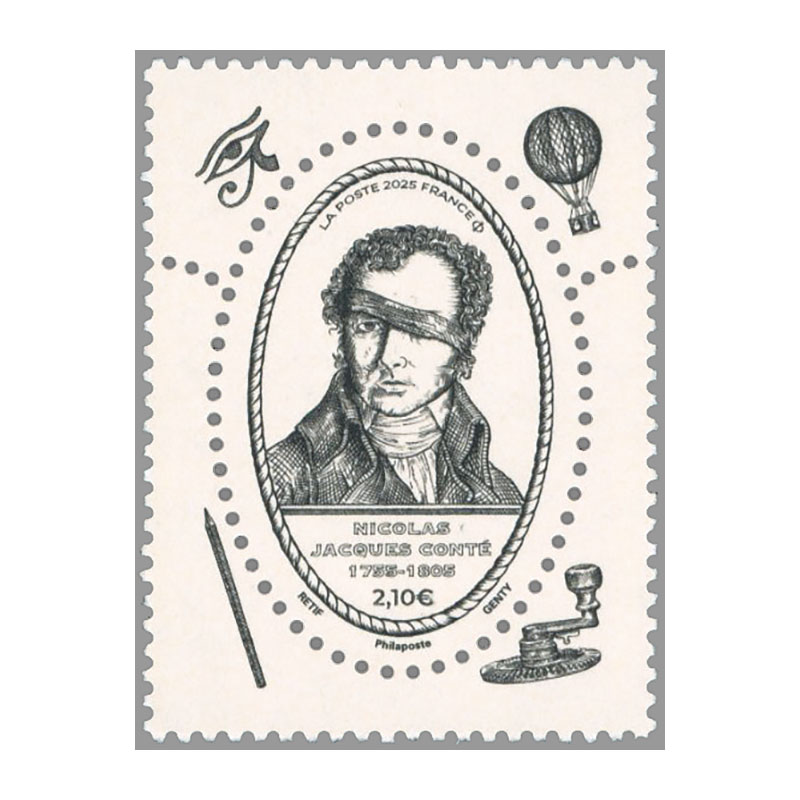 凹版。楕円形切手。フランスの画家・航空学者・発明家(1755〜1805)。鉛筆の芯やデッサン用のコンテの発明等で知られる。