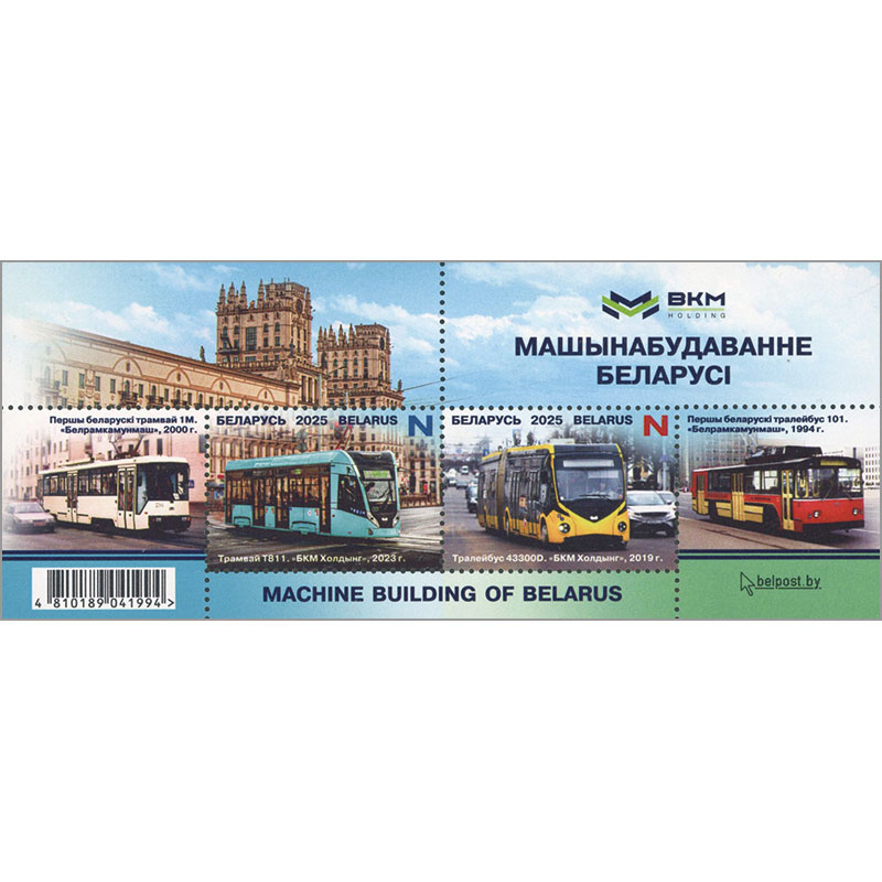 ミンスク市の単節式超低床式路面電車BKM(ベルコムンマッシュ)製T811、サラエボ市の低床連節トロリーバス(無軌条電車)同43300D。左右のタブにベラルーシ初の路面電車1M(2000年)と同トロリーバス101型(1994年)。