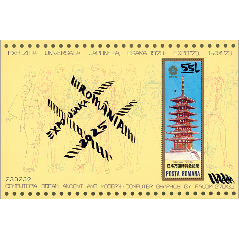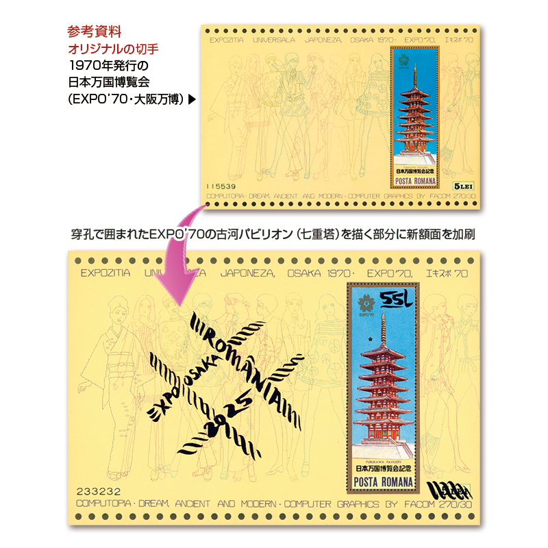 1970年発行の「日本万国博覧会(EXPO’70・大阪万博)」の小型シートに加刷。穿孔で囲まれたEXPO’70の古河パビリオン(七重塔)を描く部分に新額面を加刷。