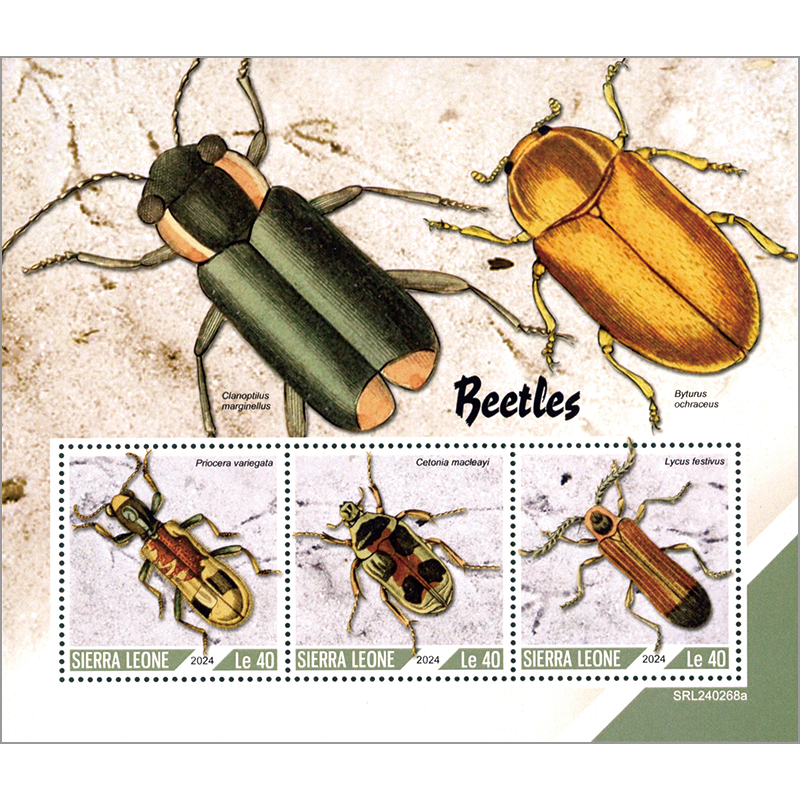 Priocera variegata(カッコウムシ科)、Trichaulax macleayi(ハナムグリ属)、 Lycus festivus(ベニボタル科)。シート地にジョウカイモドキ科とキスイモドキ科。