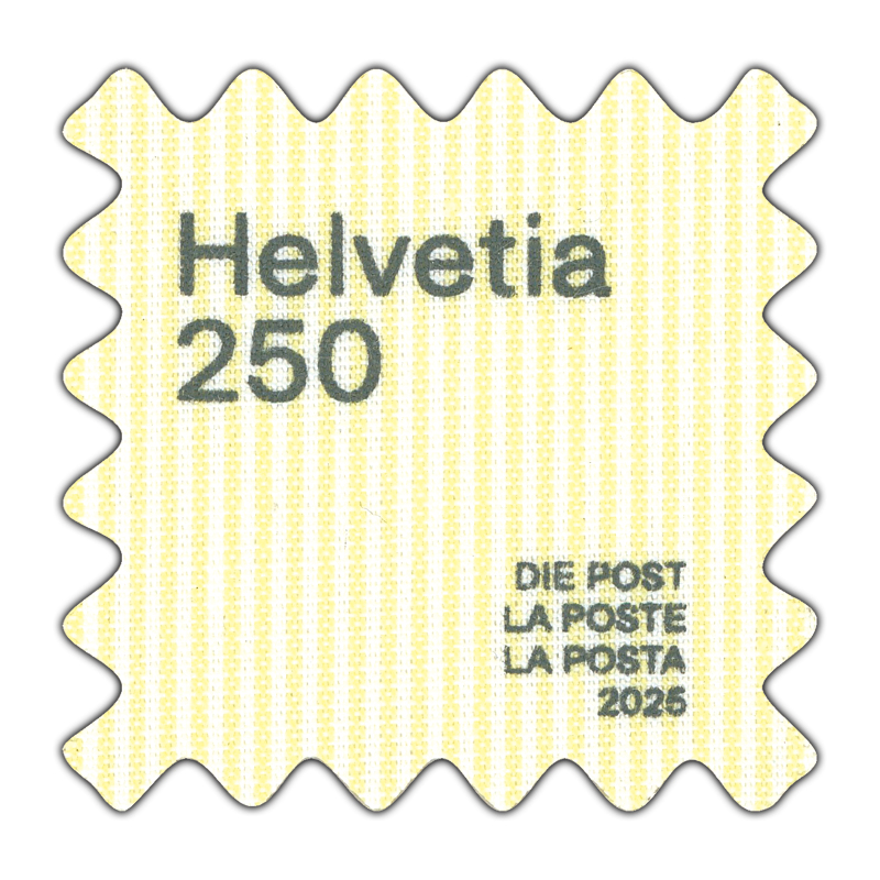 スイスポストの制服生地(旧デザイン)を使用した“アップサイクリング切手”。