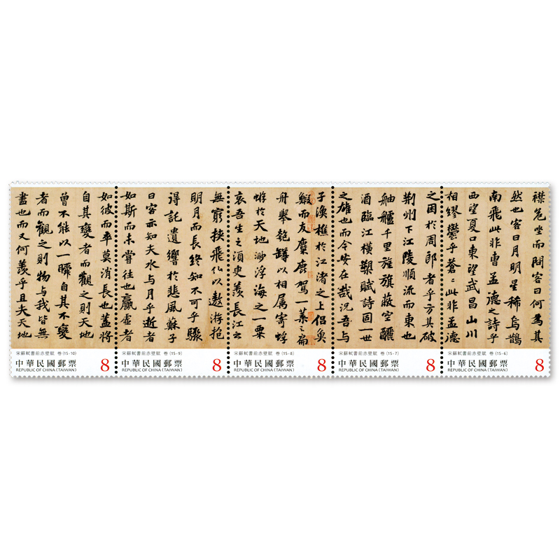 中国北宋時代の詩人、政治家、書家、画家・蘇軾(そしょく、1037〜1101)の代表作で中国古典文学の金字塔とされる「赤壁賦(せきへきふ)」(前後2篇(「前赤壁賦」と「後赤壁賦」)によって構成)の上巻「前赤壁賦」の、台湾国立故宮博物院が所蔵する蘇軾の真筆を題材とした切手。
