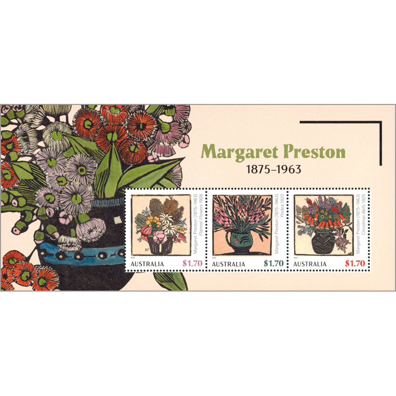 “オーストラリアの花”の木版画に彩色した作品。「フランネルフラワー」(1928)、「プロテア」(1925)、「クリスマスベル」(1925)。