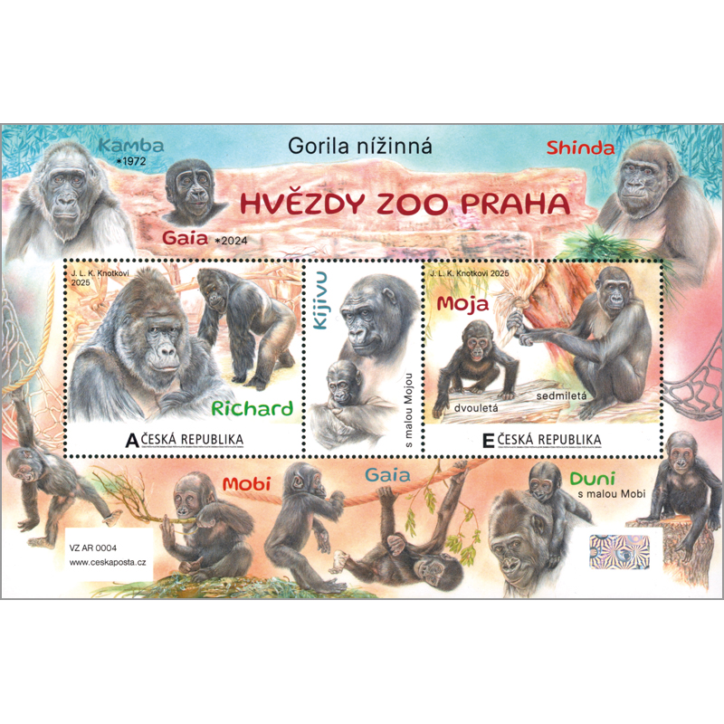 プラハ動物園のニシローランドゴリラ。雄のリチャード、チェコで生まれた最初のゴリラ、モジャ(2歳と7歳の頃)。中央タブは母親のキジブとモジャ。