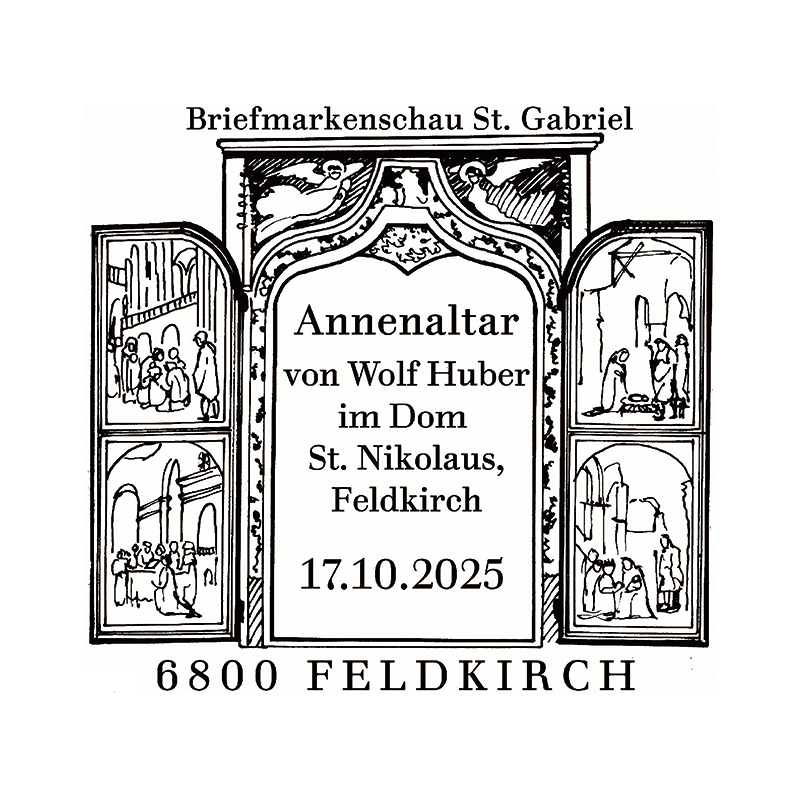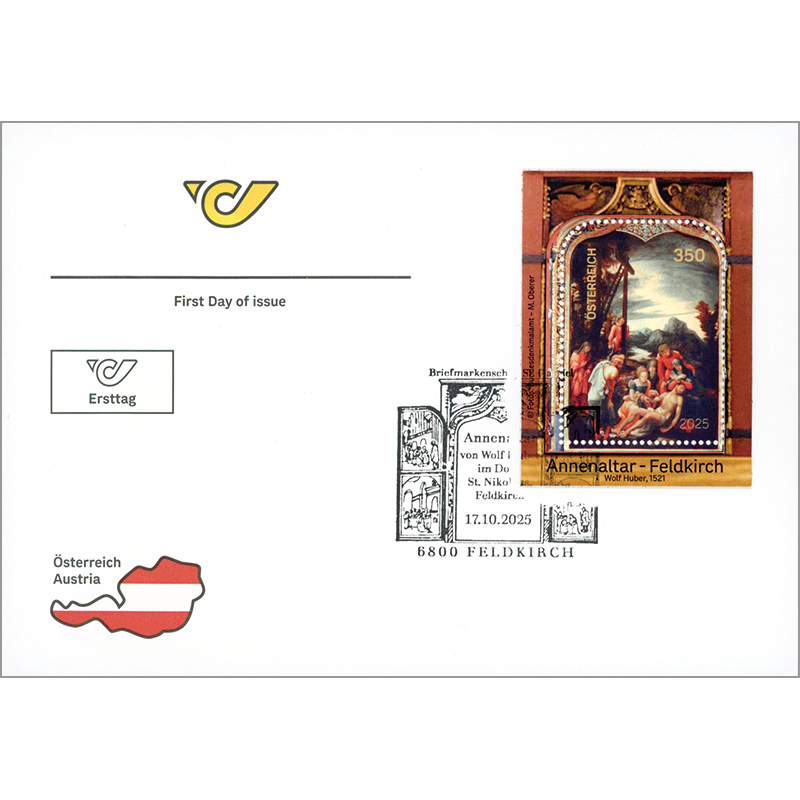 ドナウ派を代表する画家・版画家・建築家ヴォルフ・フーバー(1485〜1553)による、フェルトキルヒ大聖堂(フォアアールベルク州)の「聖アンナの祭壇画」(1521年)を再現した二重構造の小型シートから、扉部分を切り取り切手面を貼付。