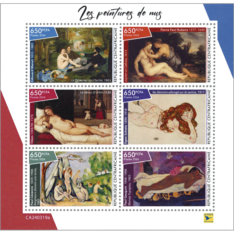 マネ「草の昼食」、ルーベンス「ユピテルとカリスト」、ティツィーノ「ウルビーノのヴィーナス」、エゴン・シーレ「腹ばいの裸婦」、セザンヌ「テントの前で水浴びする女性たち」、ゴーギャン「死霊が見ている」。