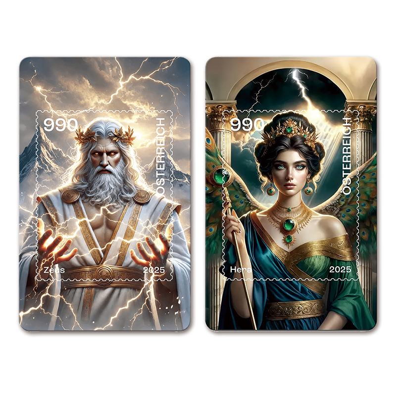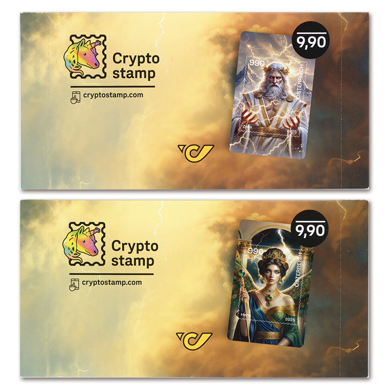 ギリシャ神話の神々を描く最新の暗号切手。本来の物理的な切手と、切手の情報をデジタルで共有するブロックチェーン技術を使用して収集・取引・交換が可能な「画像切手」を取得できる暗号切手(密閉袋ケース入り)。