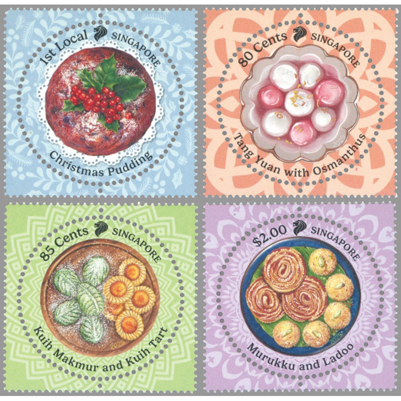 円形切手。クリスマスのプディング、春節の桂花湯円(金木犀で風味付けした白玉団子)、ハリラヤ(ラマダン月明け)のクエ・マクムール(クッキー)とパイナプップルタルト、ディパバリ(ヒンドゥー暦の正月)のムルック(渦巻きクッキー)とラドゥ(団子状のクッキー)。