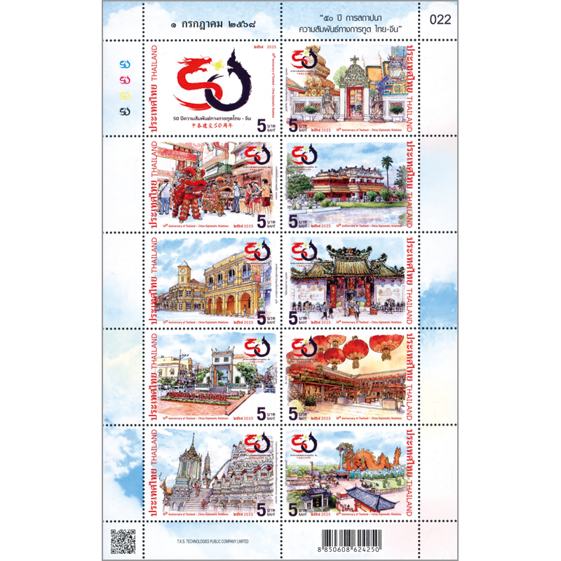 記念ロゴ1種と中国との文化的交流を表す図案9種(ワット・ポーの中国様式の石彫刻、春節の獅子舞、ウェハートチャムルーン王座、プーケット旧市街のシノ・ポルトガル(中華・ポルトガル様式)建築群、バンコクの中国寺院・龍蓮寺、ソンクラー旧市街(中華街)、スパンブリー県の天龍公園ほか。