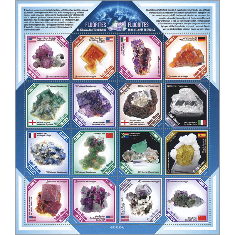産出地の蛍石(フローライト)。米ケイブ・イン・ロック、米ワイト・ロック、メキシコ・オヘラ、独ヨハネスシャハト、イングランド・ロジャリー、米エルムウッド、イングランド・ボルトバーン、伊・コルヴァーラ、仏ル・ベ、中国・信陽、南ア・リームファスマーク、スペイン・モスコナ、米アイアンヒル、米デントン、米スモーキーホーク、中国・湘西。