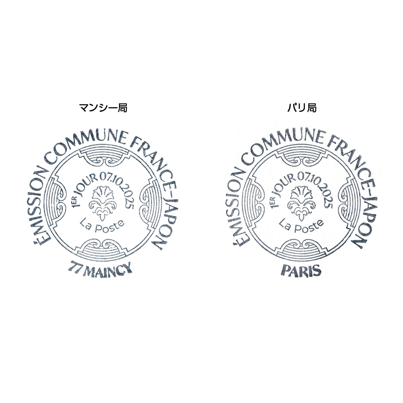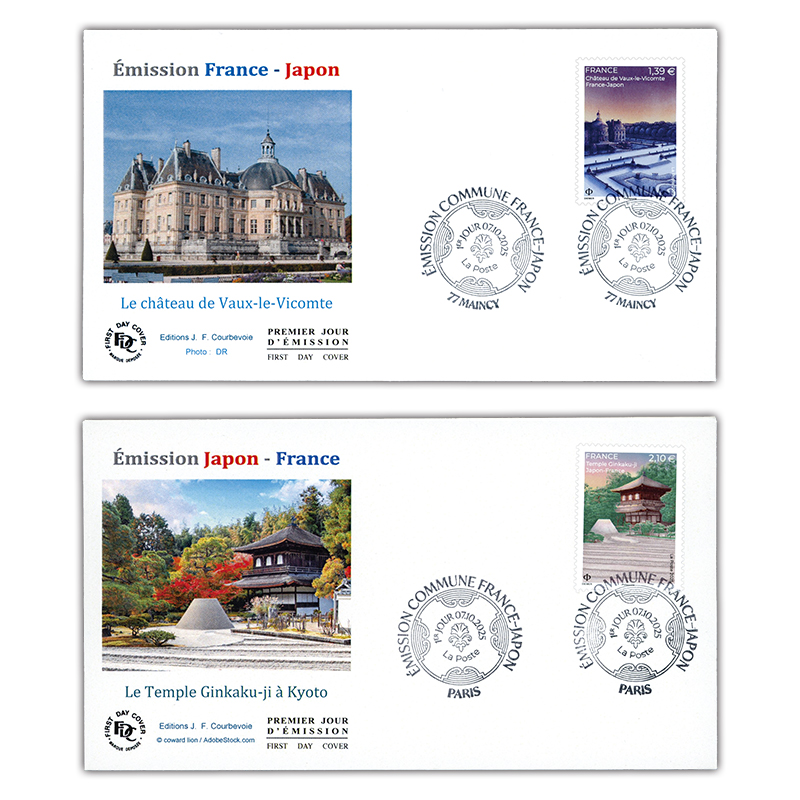 1種ずつを貼付。消印はヴォー・ル・ヴィコント城があるマンシーとパリ・先行発行日(2025.10.7)付け。
