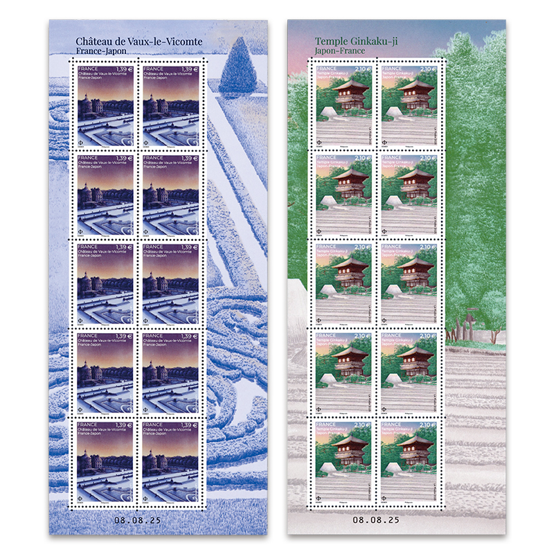 ヴォー・ル・ヴィコント城、銀閣寺。日本(「国際文通週間」)との共同発行・共通図案。