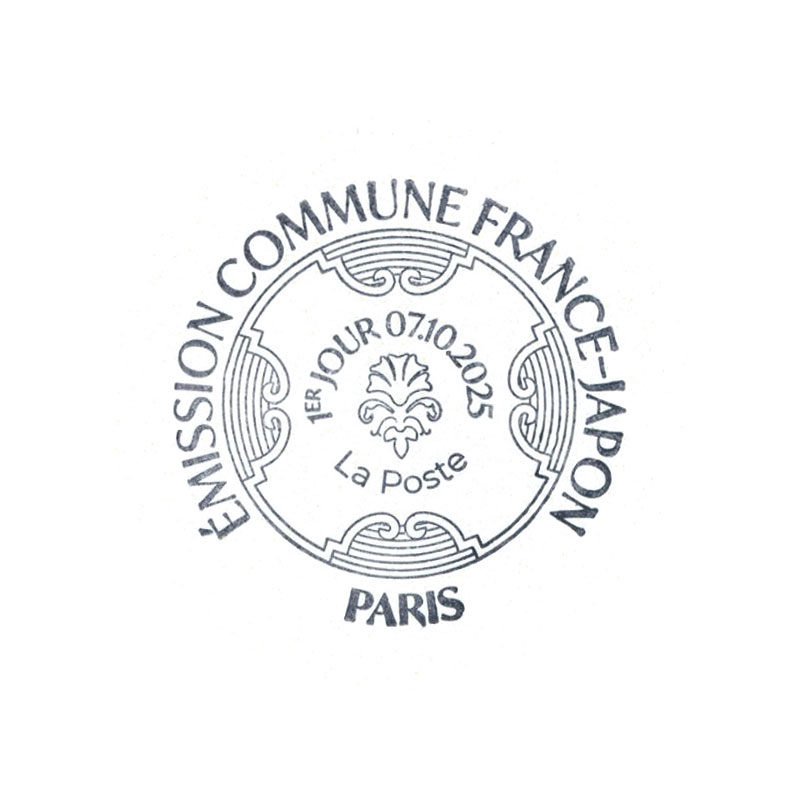 消印はパリ・先行発行日(2025.10.7)付け。フランス、日本発行切手各2種ずつを貼付。押印はフランス発行切手のみ。
